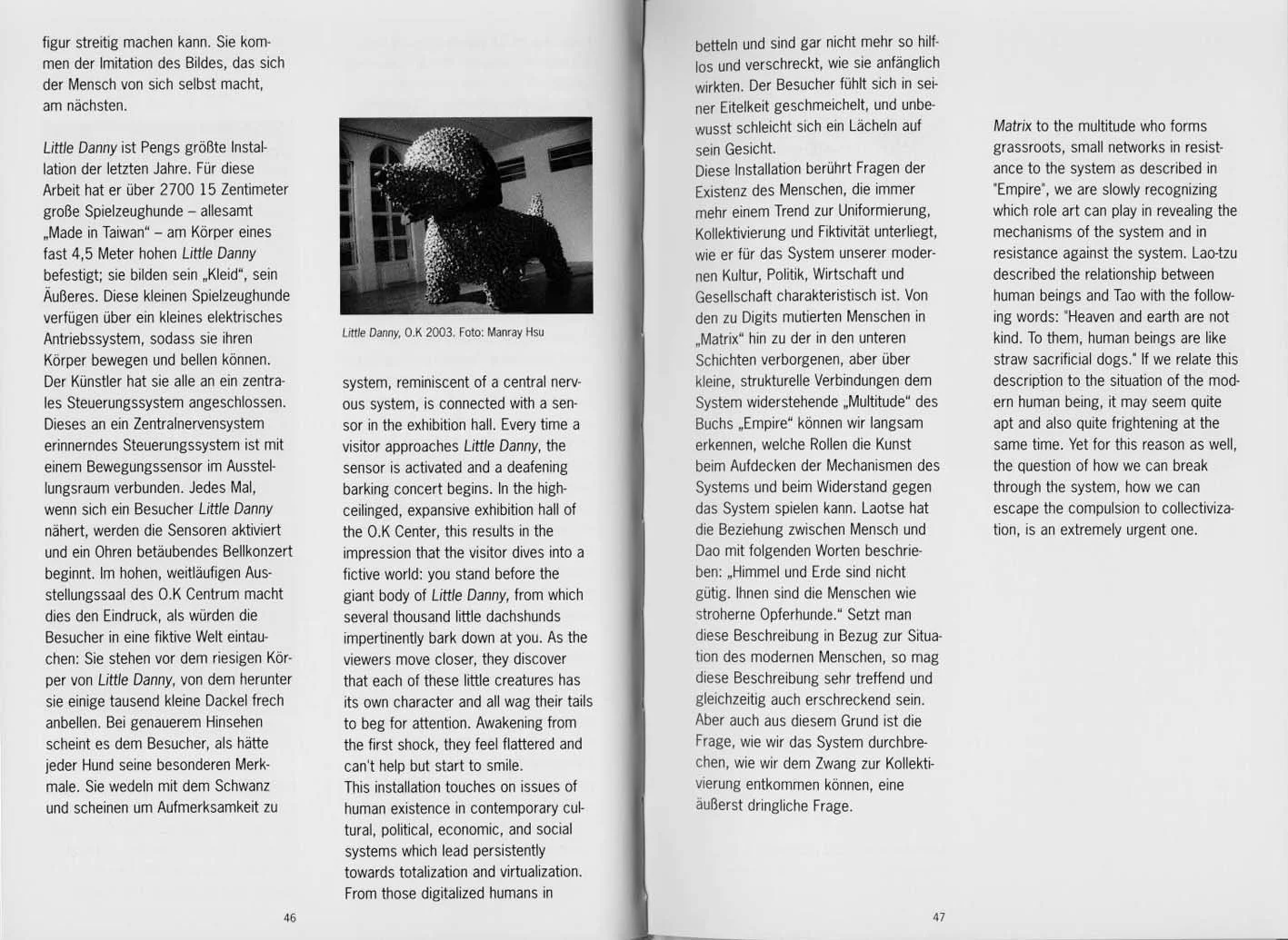 "Little Danny" is Peng's largest installation in recent years. For this work, he attached over 3000 15-centimeter big toy dogs - all of them "Made in Taiwan" - to the body of an almost 4.5 meter high "Little Danny"; they form its "clothing", its exterior. These little toy dogs have a small electronic drive system, so that they can move their bodies and bark. The artist connected all of them to a central control system. This control system, reminiscent of a central nervous system, is connected with a movement sensor in the exhibition hall. Every time a visitor approaches "Little Danny", the sensors are activated and a deafening barking concert begins. In the high-ceilinged, expansive exhibition hall of the O.K Center, this results in the impression that the visitor dives into a fictive world: you stand before the giant body of "Little Danny", from which several thousand little dachshunds impertinently bark down at you. At a closer look, it appears to the visitor that each dog has its own special features. They wag their tails and seem to beg for attention and are not at all as helpless and timid as they first appeared. The visitor feels flattered and unconsciously begins to smile.