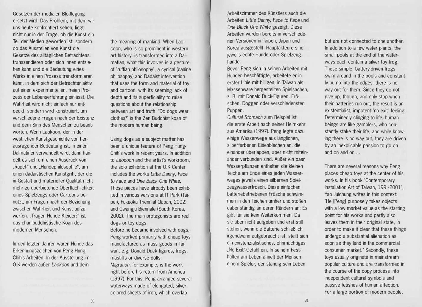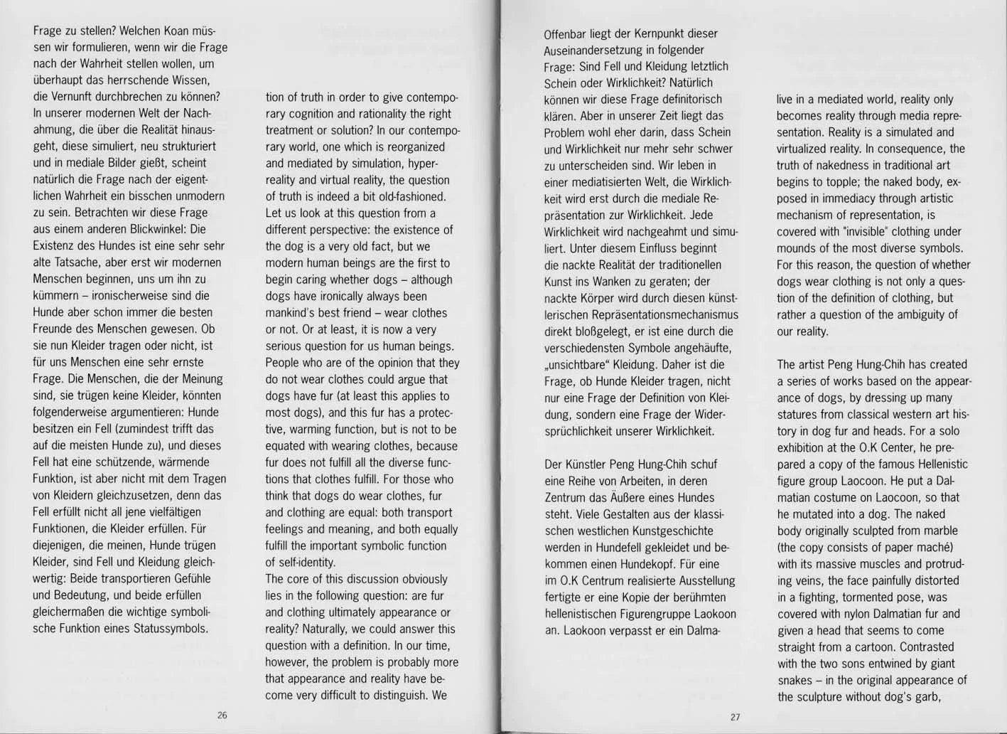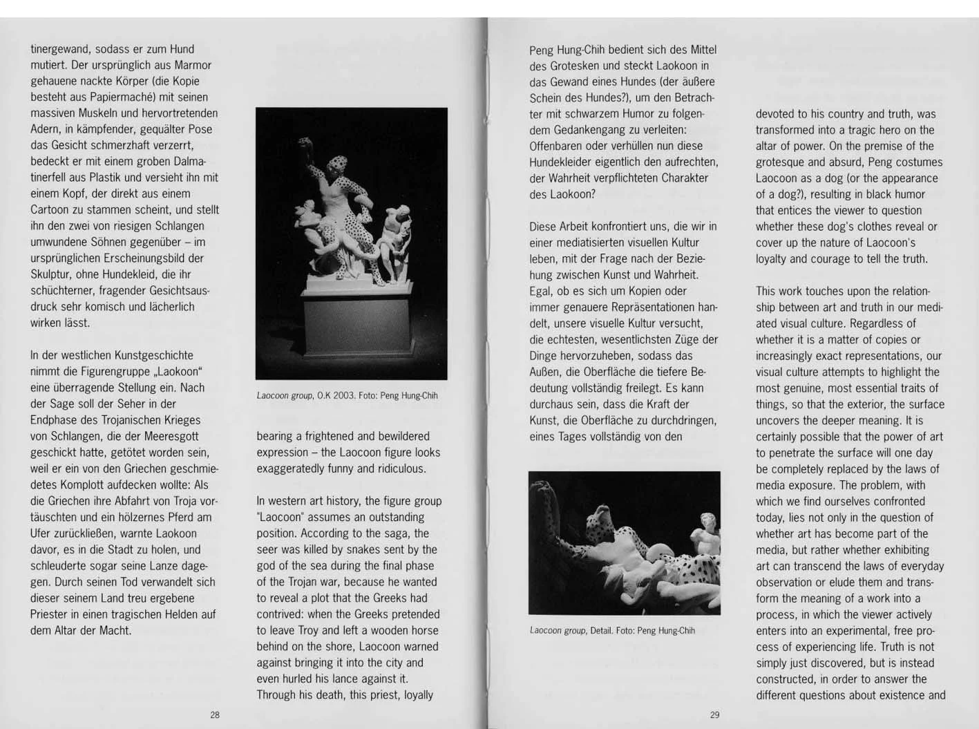 The artist Peng Hung-chih has created a series of works revolving around the exterior of a dog. Many figures from classical western art history are clothed in dog fur and given the head of a dog. For an exhibition at the O.K Center, he prepared a copy of the famous Hellenistic figure group Laokoon. He put a Dalmatian costume on Laokoon, so that he mutated into a dog. The naked body originally sculpted from marble (the copy consists of paper mach?) with its massive muscles and protruding veins, the face painfully distorted in a fighting, tormented pose, was covered with rough Dalmatian fur from plastic and given a head that seems to come straight from a cartoon. This figure is contrasted with the two sons entwined by giant snakes - in the original appearance of the sculpture, without dog's garb, making their shy, questioning facial expression appear comical and ridiculous.