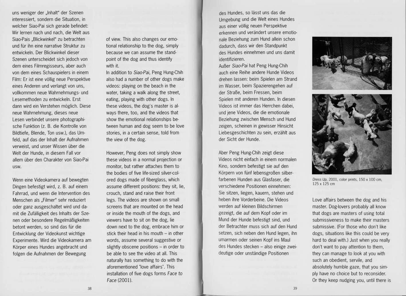 However, Peng Hung-chih not only had dogs "film" videos, he also took the camera in hand himself to record the world of dogs. These works have several special characteristics: 1. The artist slips into the role of the master or observer and films from an objective position; 2. the filmed object is the dog or the relationship between dogs, i.e. the socio-ecology of the dog; 3. the video is presented in the style of a documentary film, featuring dynamic, but also static passages; 4. the intention of filming is the same as with a fable, the aim is to make fun of circumstances from human life. With regard to this last point, these works differ substantially from the video works of the series "Face to Face": with the latter, the aim is primarily to reverse the "dog perspective" and the "observer perspective", in order to attain a rearrangement of the relationship between human and dogs through this conspiratorial reversal, for which reason the metaphorical proportion is not particularly high.