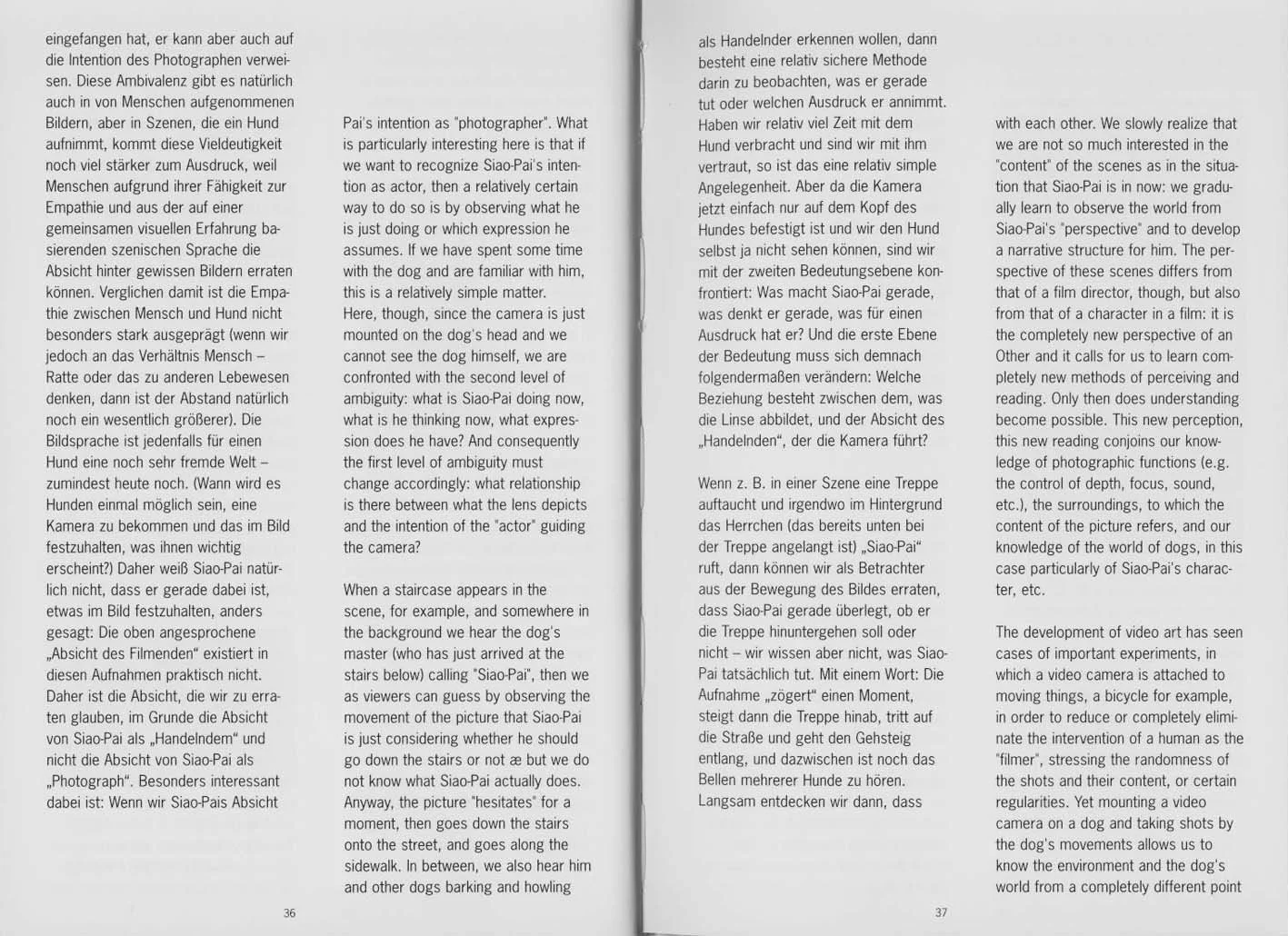 When a staircase appears in the scene, for example, and somewhere in the background we hear the dog's master (who has just arrived at the stairs below) calling "Siao-Pai", then we as viewers can guess by observing the movement of the picture that Siao-Pai is just considering whether he should go down the stairs or not - but we do not know what Siao-Pai actually does. In short: the picture "hesitates" for a moment, then goes down the stairs onto the street, and goes along the sidewalk. In between, we also hear more dogs barking. We slowly realize that we are less interested in the "content" of the scenes than in the situation that Siao-Pai is in now: we gradually learn to observe the world from Siao-Pai's "perspective" and to develop a narrative structure for him. The perspective of these scenes differs from that of a film director, though, but also from that of an actor in a film: it is the completely new perspective of an Other and it calls for us to learn completely new methods of perceiving and reading. Only then does understanding become possible. This new perception, this new reading conjoins our photographic function (e.g. the control of depth, focus, sound, etc.), the surroundings, to which the content of the picture refers, and our knowledge of the world of dogs, in this case particularly of Siao-Pai's character, etc.