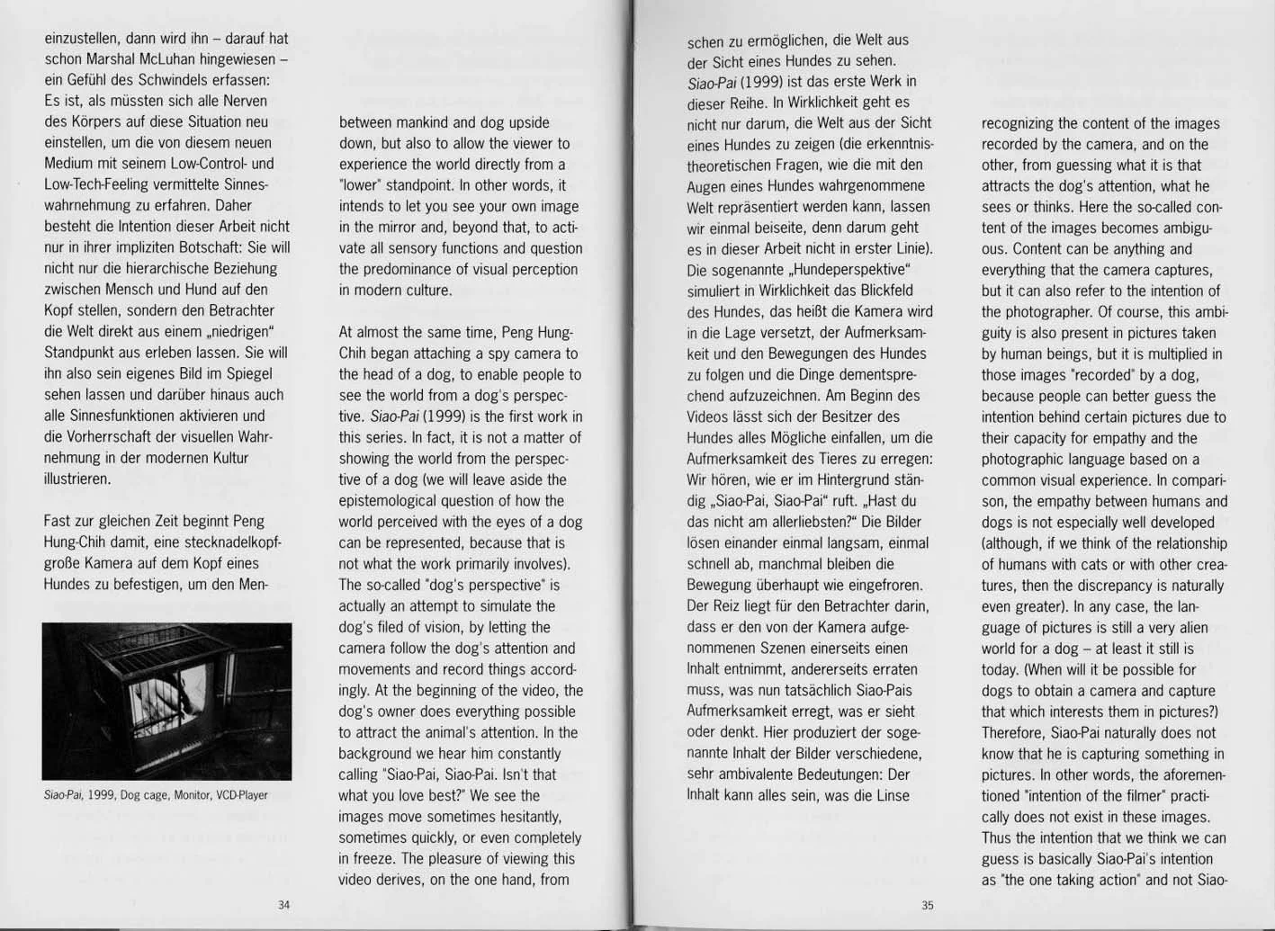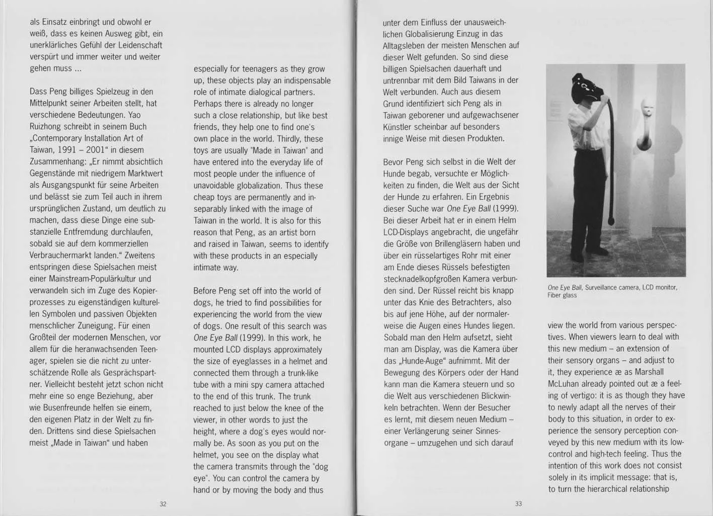 Before Peng set off into the world of dogs, he tried to find possibilities for experiencing the world from the view of dogs. One result of this search was "One Eye Ball" (1999). In this work, he mounted LCD displays approximately the size of eyeglasses in a helmet and connected them through a trunk-like tube with a camera the size of a pinhead attached to the end of this trunk. The trunk reached to just below the knee of the viewer, in other words to just the height, where a dog's eyes would normally be. As soon as you put on the helmet, you see on the display what the camera records through the "dog eye". You can control the camera by hand or by moving the body and thus view the world from various perspectives. When viewers learn to deal with this new medium - an extension of their sensory organs - and adjust to it, they experience - as Marshall McLuhan already pointed out - a feeling of dizziness: it is as though they have to newly adapt all the nerves of their body to this situation, in order to experience the sensory perception conveyed by this new medium with its low-control and high-tech feeling. Thus the intention of this work does not consist solely in its implicit message: it is not intended to turn the hierarchical relationship between mankind and dog upside down, but rather to allow the viewer to experience the world directly from a "lower" standpoint. In other words, it intends to let you see your own image in the mirror and, beyond that, to activate all sensory functions and illustrate the predominance of visual perception in modern culture.