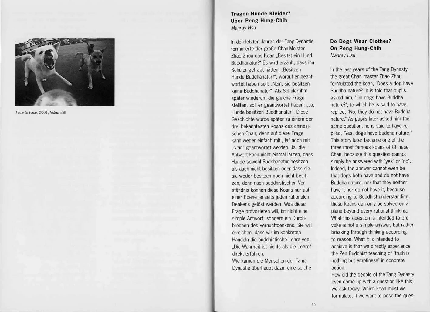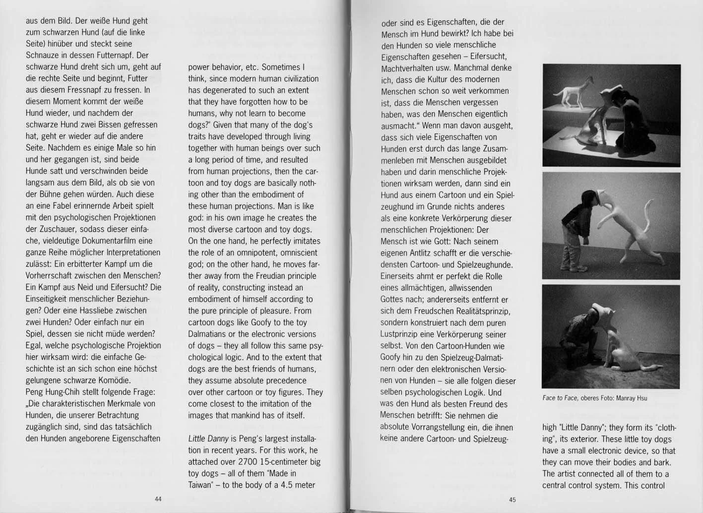 "One Black One White" (2001) is a short documentary video about two dogs (one white, one black) being fed together. Even though it actually just shows an episode from the everyday life of the dogs, the artist arranges the furnishings in the scene as though on a stage. In the beginning, we just see a room reminiscent of a stage, and two small dogs are led onto this stage by their master. Now there is a bowl of dog food on the left, and the black dogs starts eating. Then there is another bowl of dog food on the right, and the white dog begins eating. The master leaves the picture. The white dog goes over to the black dog (on the left) and sticks his nose in the other's bowl. The black dog turns around, goes over to the right and starts eating dog food from that bowl. At that moment, the white dog comes back, and as soon as the black dog has eaten two bites, he goes back to the other side. After it has gone back and forth like this several times, both dogs are full and both slowly disappear from the picture as though exiting the stage. This work, which is also reminiscent of a fable, plays with the viewers' psychological projections as well, so that this simple, ambiguous documentary film allows for a whole string of possible interpretations: A bitter struggle for dominance among people? A battle of envy and jealousy? The one-sidedness of human relationships? Or a love-hate relationship between two dogs? Or simply a game that they do not tire of? Regardless of which psychological projection comes into effect here, the simple story is already a highly successful black comedy.