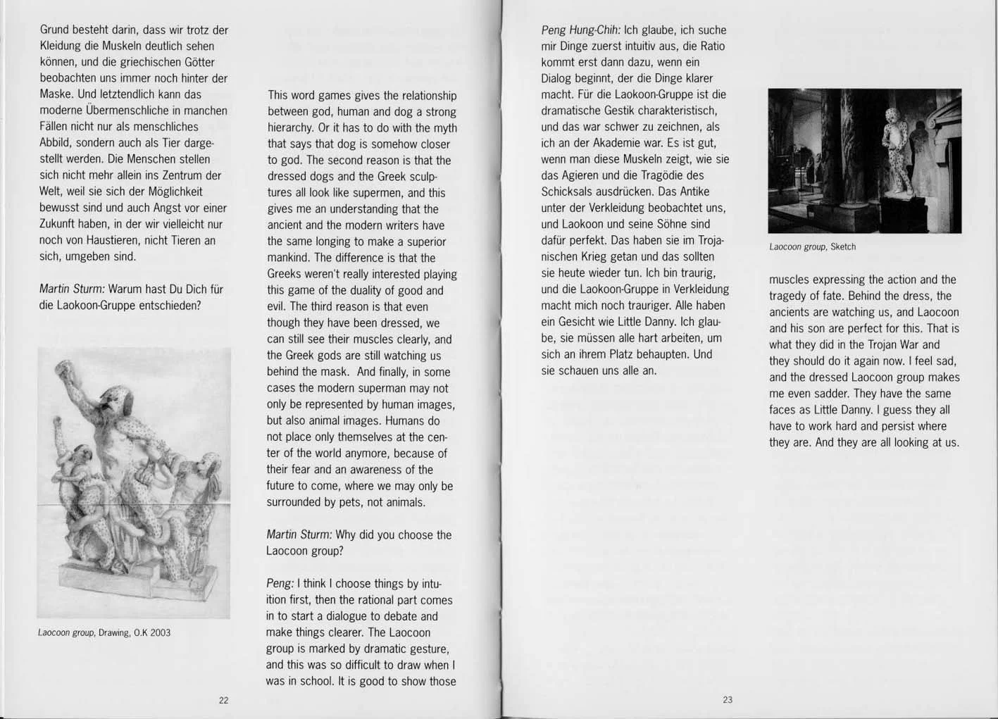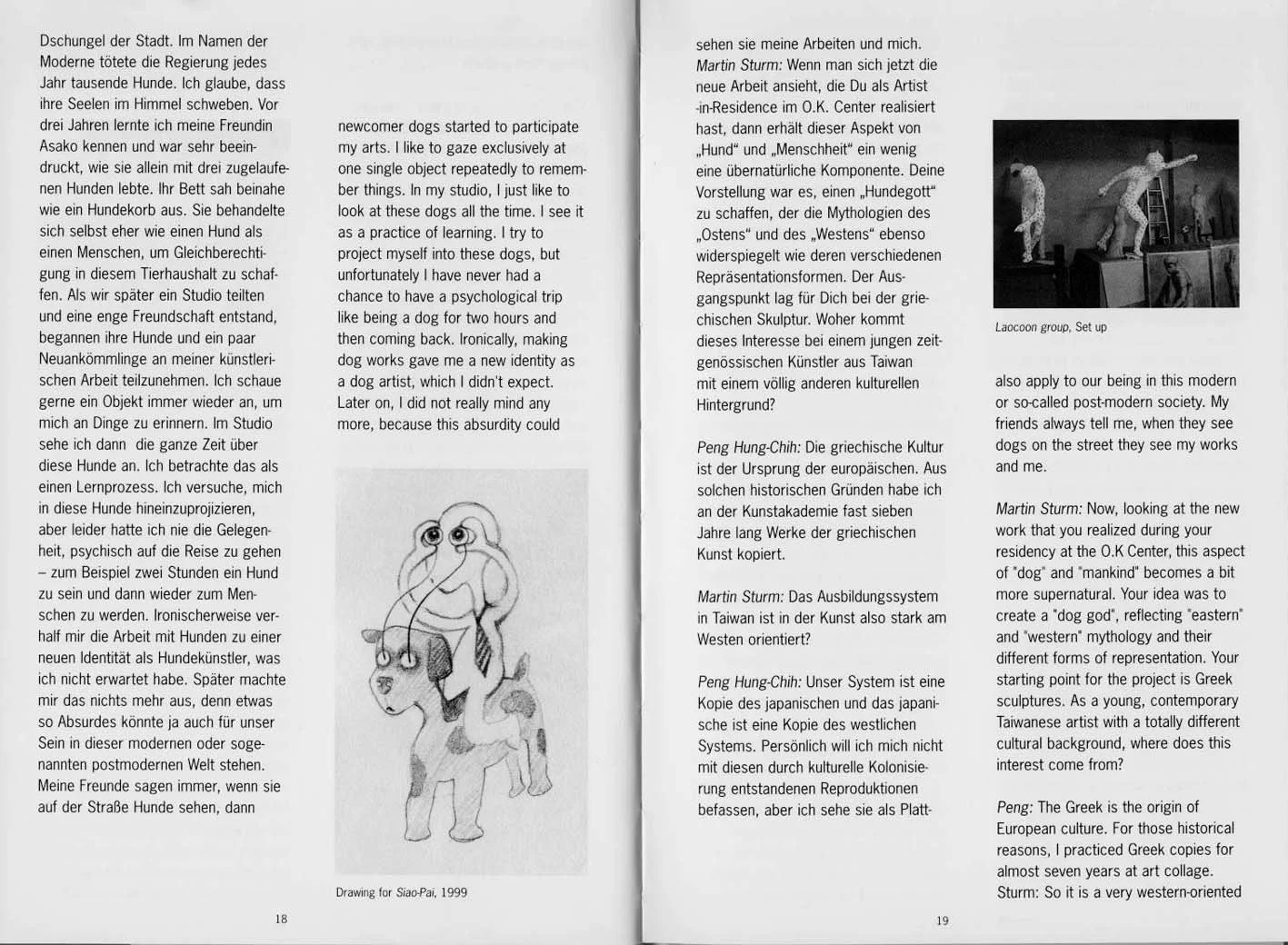 Sturm: Now, looking at the new work that you realized during your residency at the O.K Center, this aspect of "dog" and "mankind" becomes a bit more supernatural. Your idea was to create a "dog god", reflecting "eastern" and "western" mythology and their different forms of representation. Your starting point for the project is Greek sculptures. As a young, contemporary Taiwanese artist with a totally different cultural background, where does this interest come from?