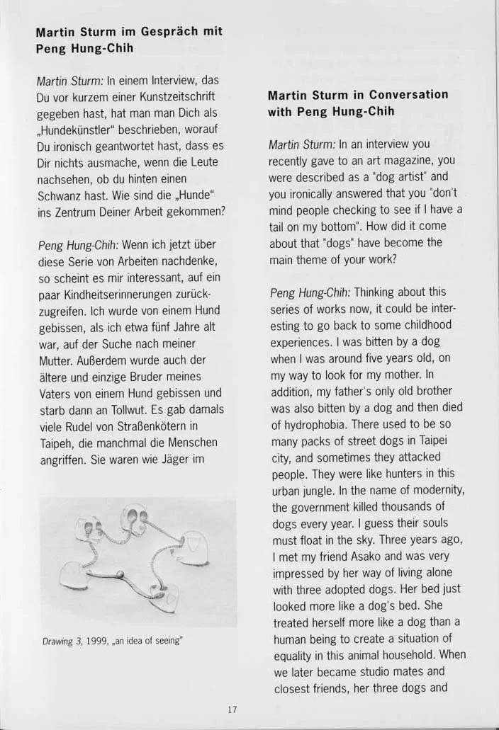 Peng: Thinking about this series of works now, it could be interesting to go back to some childhood experiences. I was bitten by a dog when I was around five years old, on my way to look for my mother. In addition, my father's only old brother was also bitten by a dog and then died of hydrophobia. There used to be so many packs of street dogs in Taipei city, and sometimes they attacked people. They were like hunters in this urban jungle. In the name of modernity, the government killed thousands of dogs every year. I guess their souls must float in the sky. Three years ago, I met my friend Asako and was very impressed by her way of living alone with three adopted dogs. Her bed just looked more like a dog's bed. She treated herself more like a dog than a human being to create a situation of equality in this animal household. When we later became studio mates and closest friends, her three dogs and newcomer dogs started to participate my arts. I like to gaze exclusively at one single object repeatedly to remember things. In my studio, I just like to look at these dogs all the time. I see it as a practice of learning. I try to project myself into these dogs, but unfortunately I have never had a chance to have a psychological trip like being a dog for two hours and then coming back. Ironically, making dog works gave me a new identity as a dog artist, which I didn't expect. Later on, I did not really mind any more, because this absurdity could also apply to our being in this modern or so-called post-modern society. My friends always tell me, when they see dogs on the street they see my works and me.