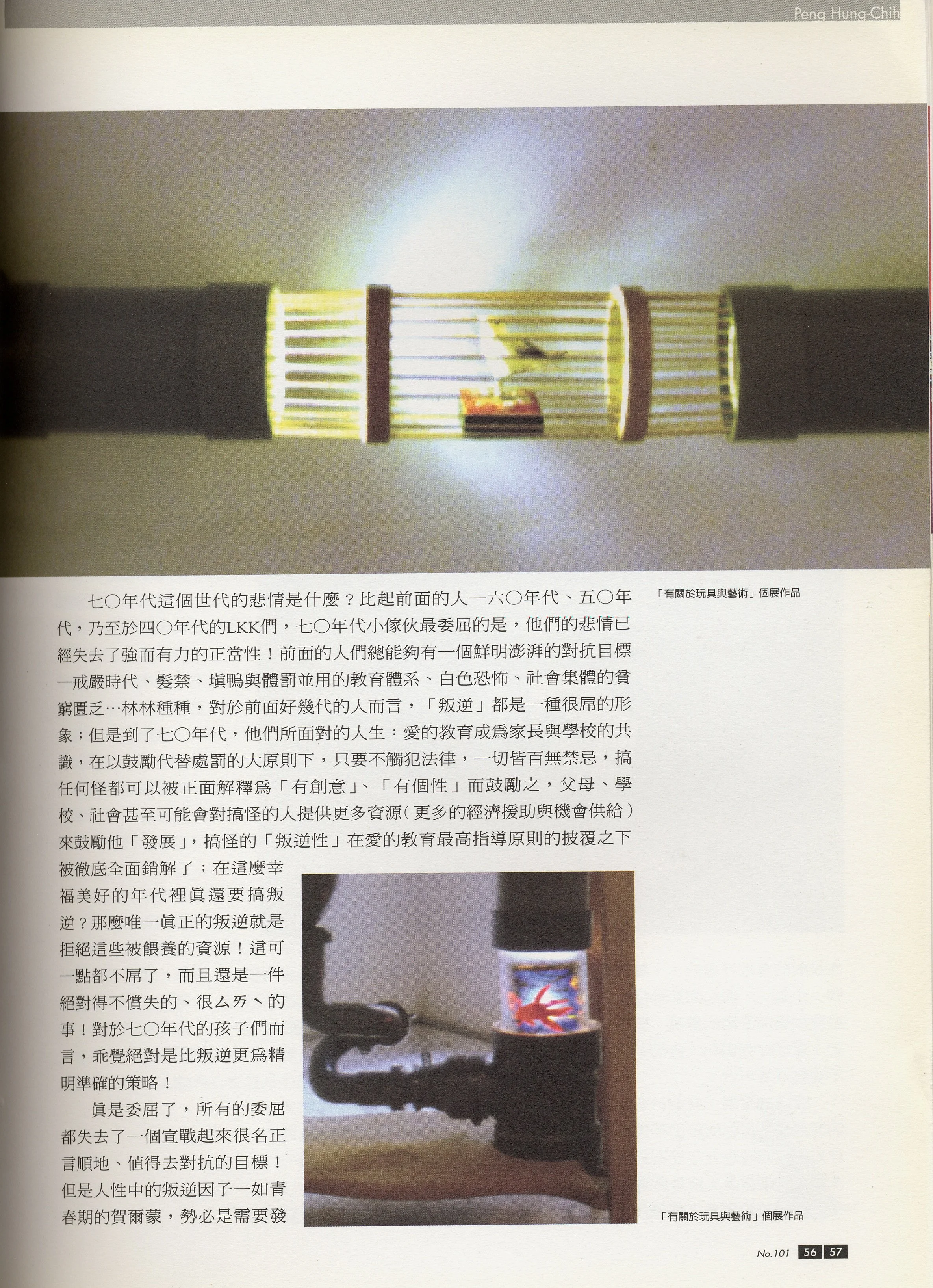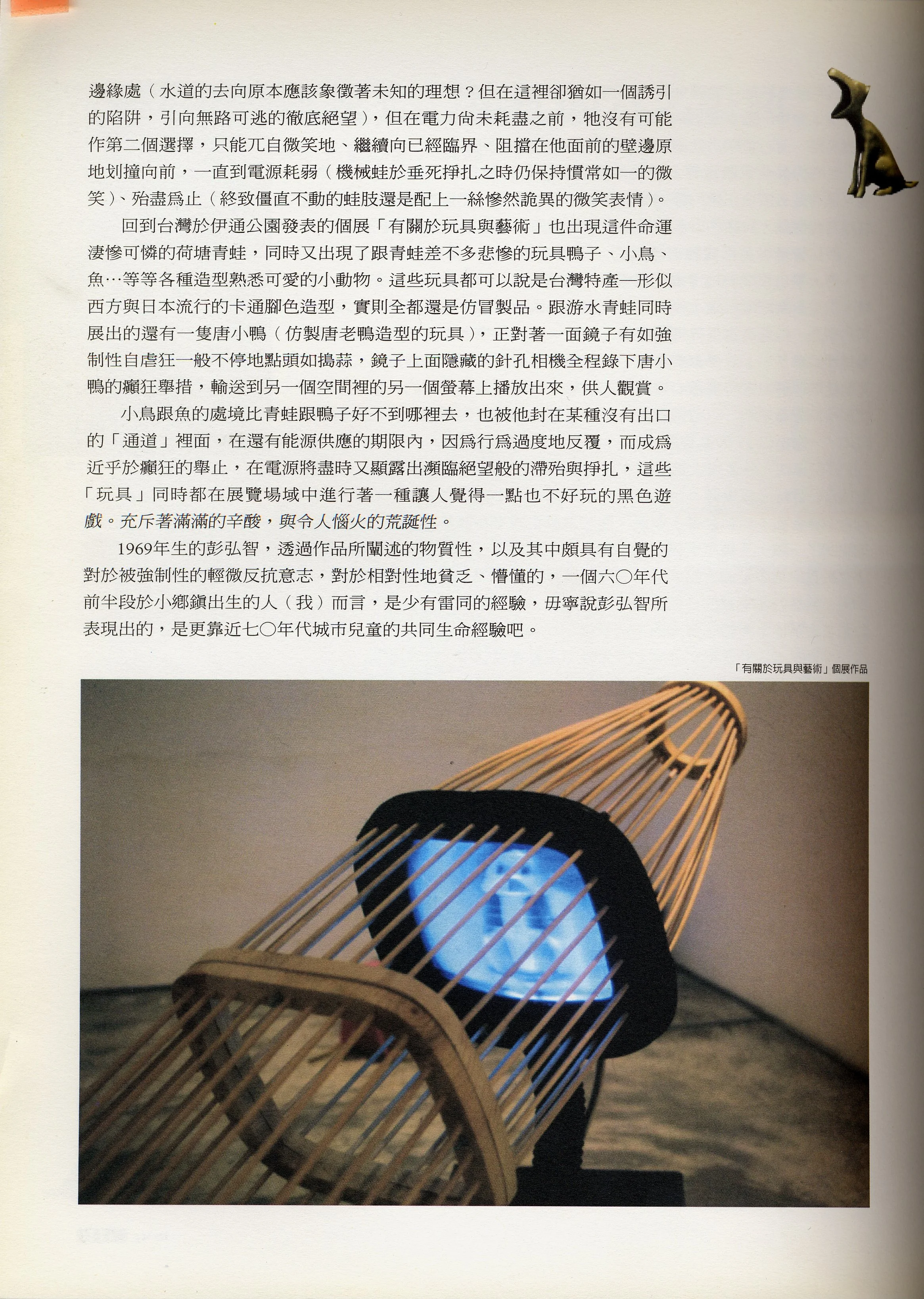 回到台灣於伊通公園發表的個展「有關於玩具與藝術」也出現這件命運淒慘可憐的荷塘青蛙,同時又出現了跟青蛙差不多悲慘的玩具鴨子、小鳥、魚……等等各種造型熟悉可愛的小動物。這些玩具都可以說是台灣特產──形似西方與日本流行的卡通腳色造型,實則全都還是仿冒製品。跟游水青蛙同時展出的還有一隻唐小鴨(仿製唐老鴨造型的玩具),正對著一面鏡子有如強制性自虐狂一般不停地點頭如搗蒜,鏡子上面隱藏的針孔相機全程錄下唐小鴨的癲狂舉措,輸送到另一個空間裡的另一個螢幕上播放出來,供人觀賞。